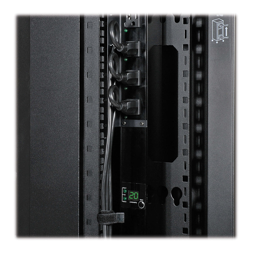 The Eaton Tripp Lite SmartRack SR48UBWD8 is a 48U extra-wide, standard-depth rack enclosure designed for high-density IT environments. Built from cold-rolled steel with a black powder-coated finish, it offers 31.5 inches of width for advanced cable routing and vertical PDU mounting, allowing unobstructed front-to-rear airflow.
