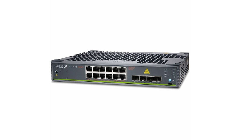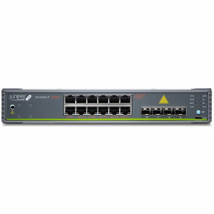 The Juniper EX4100-F-12P-TAA is a compact, fanless, TAA-compliant Ethernet switch designed for enterprise branches, remote offices, and campus networks. Featuring 12 x 1GbE PoE+ access ports with up to 30W per port and a total PoE budget of 300W, it supports seamless connectivity for IP phones, IoT devices, Wi-Fi 6 access points, and more.