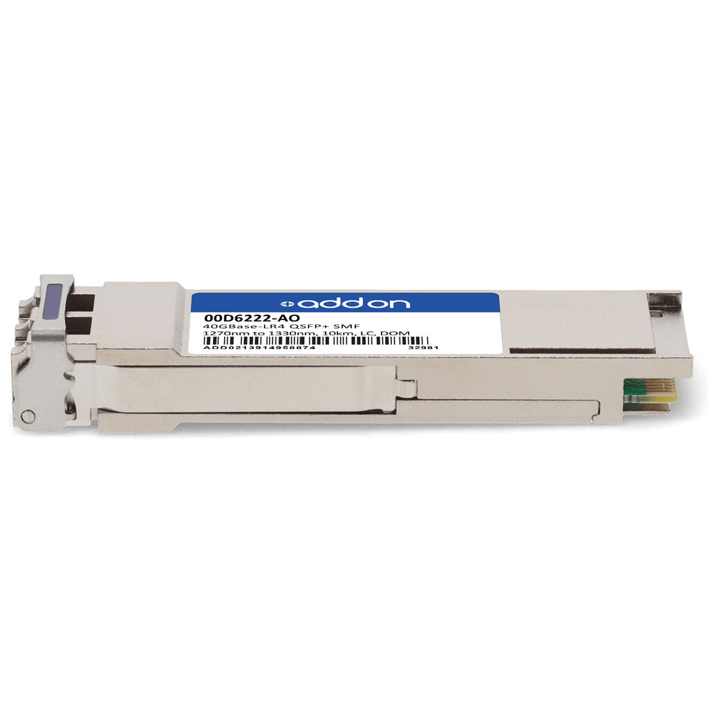 The IBM® 00D6222 Compatible TAA 40GBase-LR4 QSFP+ Transceiver from AddOn delivers high-performance, reliable connectivity for 40GBase Ethernet networks. Supporting transmission up to 10km over single-mode fiber (SMF) with wavelengths ranging from 1270nm to 1330nm, this module features a duplex LC connector and full Digital Optical Monitoring (DOM) for real-time parameter tracking.