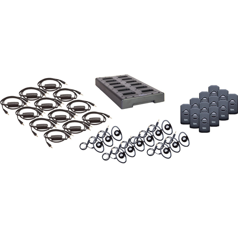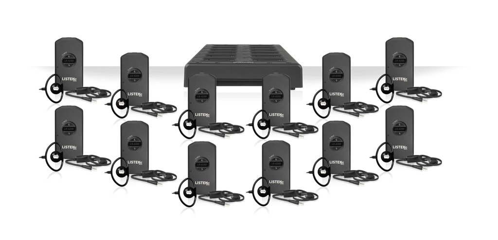 Each receiver includes an OLED display for easy channel selection, setup, and battery status monitoring. Built with user comfort and accessibility in mind, the lightweight receivers are compact, rechargeable, and simple to operate. The package includes integrated neck loops/lanyards, universal ear speakers, and a 12-unit intelligent charging tray for efficient management and recharging.