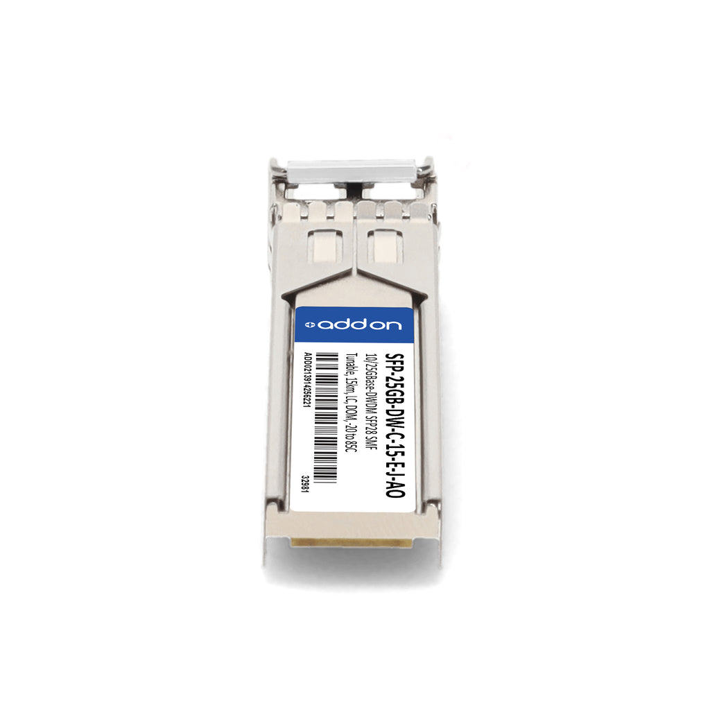 The AddOn Juniper Networks® SFP-25GB-DW-C-15-E-J-AO is a dual-rate 10/25GBase-DWDM SFP28 transceiver designed for high-capacity access, metro, and enterprise networks. Delivering data rates of 10Gbps and 25Gbps (with FEC) over single-mode fiber (SMF) up to 15 km, this hot-swappable module features a tunable 100 GHz DWDM wavelength range (1528.77 nm – 1566.31 nm) with precise wavelength accuracy and robust performance.