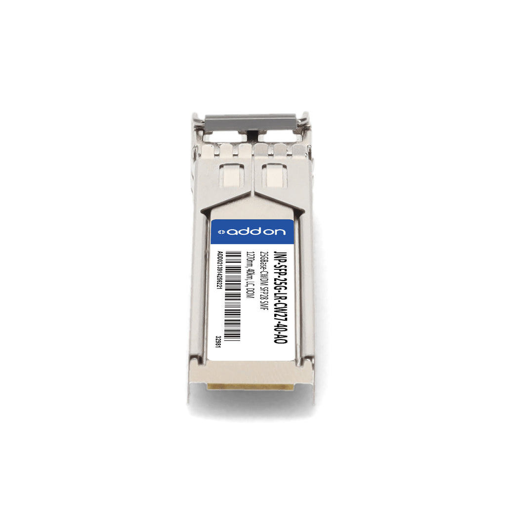 The AddOn Juniper Networks® JNP-SFP-25G-LR-CW27-40 Compatible TAA 25GBase-CWDM SFP28 Transceiver delivers reliable, high-speed connectivity for modern enterprise, metro, and mobile fronthaul networks. Operating at a wavelength of 1270nm over single-mode fiber (SMF), this CWDM transceiver supports data rates up to 25.78Gbps and extends transmission distances up to 40km using an LC connector.