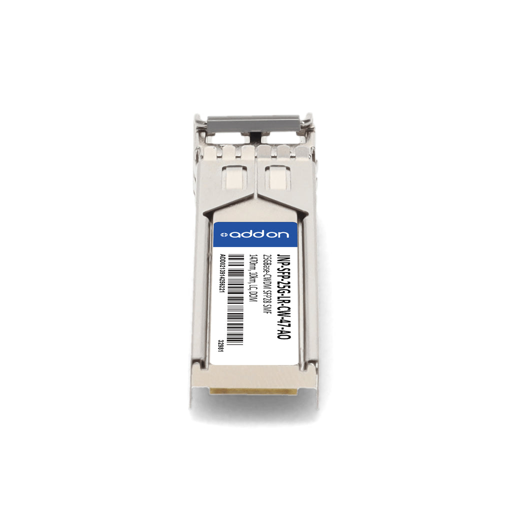 The AddOn Juniper Networks® JNP-SFP-25G-LR-CW-47-AO is a high-performance, TAA-compliant 25GBase-CWDM SFP28 transceiver designed for up to 10km transmission over single-mode fiber (SMF) using a 1470nm wavelength through a duplex LC connector. Engineered for seamless compatibility, it delivers reliable 25.78Gbps bi-directional data links and is fully compliant with SFF-8431, SFF-8432, and SFF-8472 standards. With built-in dual CDR, CWDM-rated EML transmitter, and APD receiver, this hot-swappable transceiver ensures robust network performance for demanding applications such as access, metro, and enterprise networks, as well as mobile fronthaul (CPRI/OBSAI). Digital Optical Monitoring (DOM) enables real-time diagnostics of critical parameters, and each unit is uniquely serialized, thoroughly tested, and guaranteed to initialize and operate identically to the OEM equivalent — all backed by AddOn’s limited lifetime warranty.