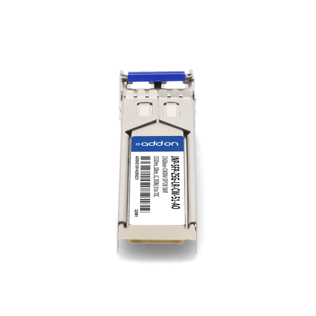 The AddOn Juniper Networks® JNP-SFP-25G-LR-CW-51 Compatible TAA 25GBase-CWDM SFP28 Transceiver delivers reliable, high-speed data transmission up to 25.78 Gbps over single-mode fiber (SMF) using a 1510nm wavelength and duplex LC connector. Designed for seamless integration with Juniper Networks® equipment, this hot-swappable transceiver supports distances up to 10km and features a built-in dual CDR with bypass function for enhanced signal integrity. It is fully compliant with SFP28 MSA, SFF-8431, SFF-8432, and SFF-8472 standards, ensuring robust performance across access, metro, enterprise, and mobile fronthaul applications. With Digital Optical Monitoring (DOM) support, users gain real-time visibility into key operating parameters. TAA compliant, RoHS certified, and Class 1 laser safety approved, this module provides dependable performance backed by a limited lifetime warranty.