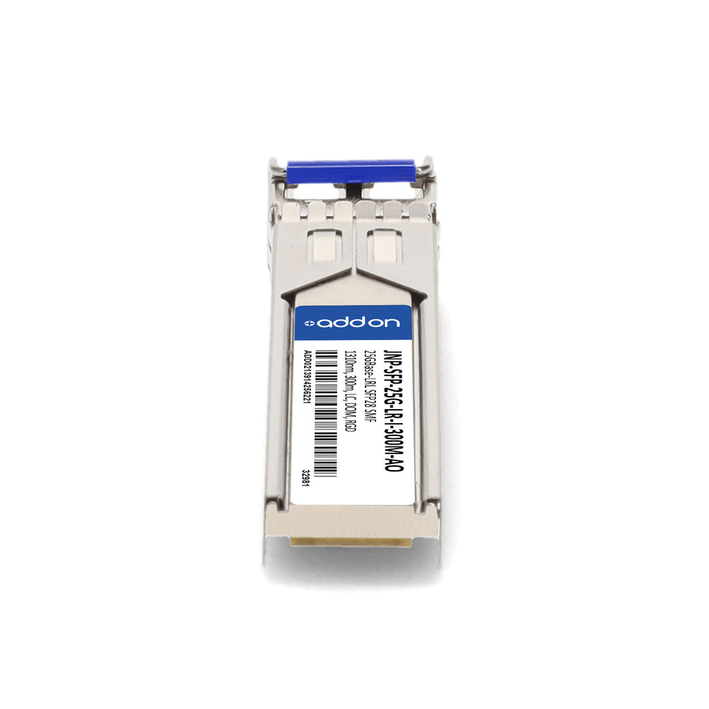 The AddOn Juniper Networks® JNP-SFP-25G-LR-I-300M-AO is a high-performance, TAA-compliant SFP28 transceiver designed to deliver reliable 25GBase-LRL Ethernet connectivity over single-mode fiber (SMF) up to 300 meters using a 1310 nm wavelength. Engineered for seamless compatibility with Juniper Networks® equipment, this hot-swappable transceiver features a duplex LC connector and supports digital optical monitoring (DOM) for real-time diagnostics. It offers exceptional electrostatic discharge (ESD) protection, operates across an extended industrial temperature range of -40 °C to 85 °C, and meets SFF-8402 and SFF-8472 standards. Each unit is uniquely serialized, thoroughly tested for data traffic and application performance, and backed by a limited lifetime warranty — ensuring dependable, long-term network operation in access, enterprise, and high-performance environments.