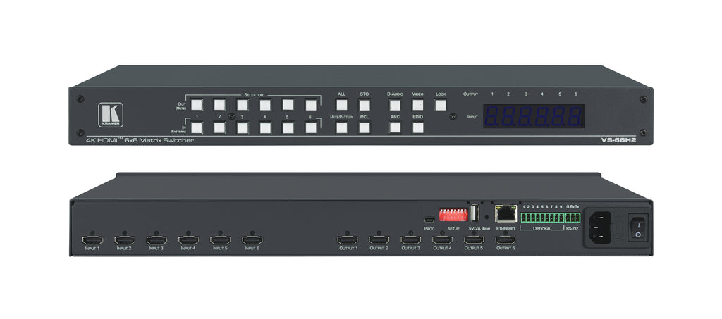The Kramer VS-66H2 is a professional-grade 6×6 HDMI matrix switcher built for high-performance 4K AV routing in conference rooms, control centers, classrooms, digital signage networks, and multi-display environments. It allows six independent HDMI sources to be routed to six HDMI displays with clean, seamless switching and advanced EDID management for fully optimized interoperability.