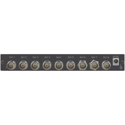 The Kramer VM-8UX is a compact, high-performance 1:8 12G-SDI distributor designed for professional broadcast workflows requiring pristine 4K signal distribution. It automatically adapts to the incoming SDI data rate, equalizes and re-clocks the signal to extend transmission distance, and delivers eight identical, ultra-stable outputs. Built with reliable lockable BNC connectors and a fanless DigiTOOLS™ enclosure, the VM-8UX ensures robust, noise-free operation in studios, production facilities, and live broadcast environments.