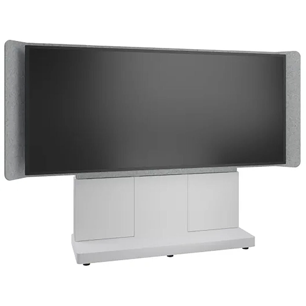 Designed specifically for environments that require seamless interaction, this stand accommodates a single 105" 21:9 Ultra-Wide aspect ratio display, such as the Jupiter Pana 105. Wrapped in acoustic felt, it ensures crystal clear audio for your meetings while maintaining a sleek and professional appearance.