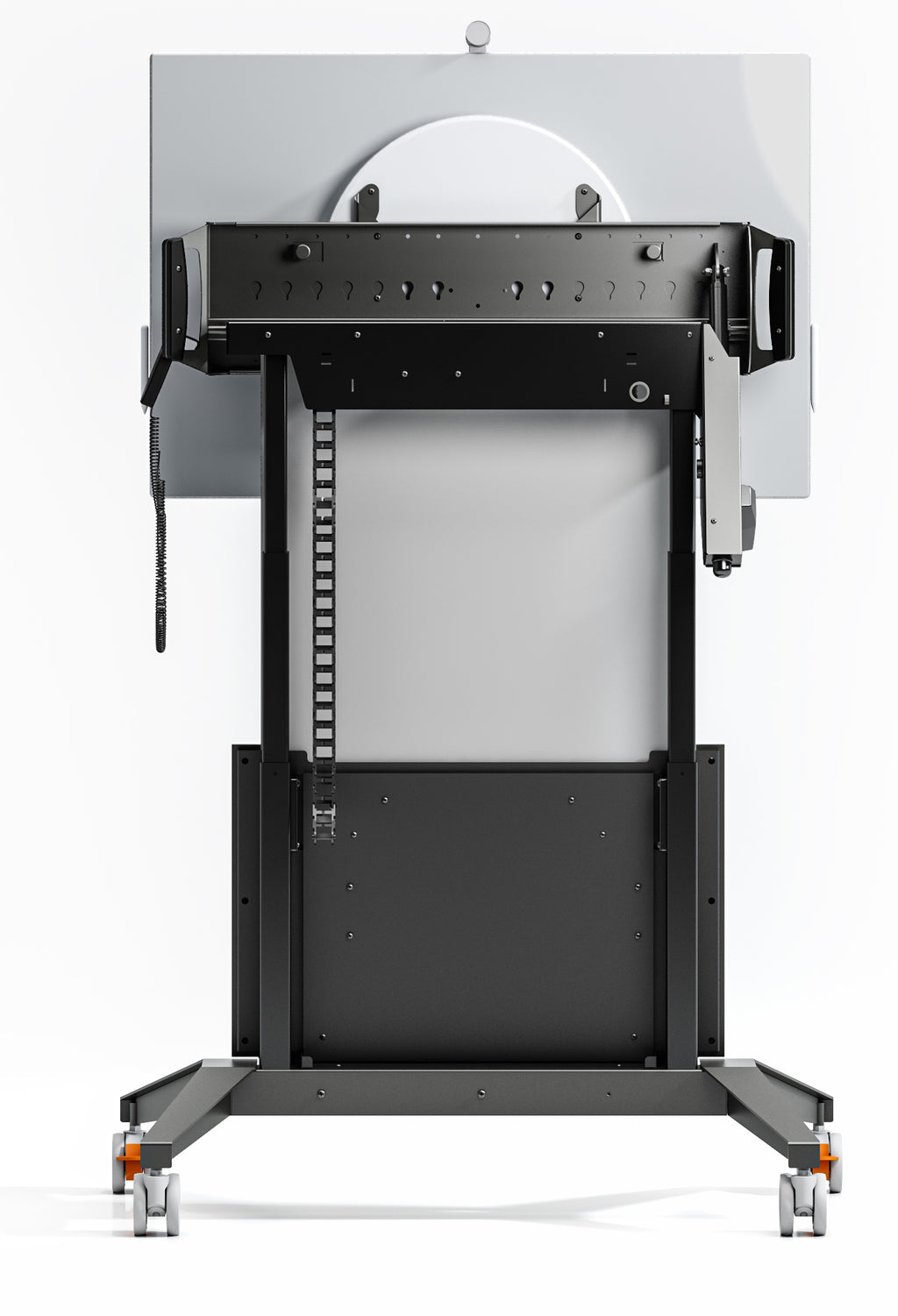 Constructed from durable powder-coated steel and veneered MDF panels, it features a motorized lift and tilt mechanism controlled by a wired remote with independent adjustments. The stand includes integrated cable management, electronic storage, and high-quality commercial-grade casters for effortless mobility. Its compact, telescopic design ensures easy transport and storage, while optional accessories—such as cable reels, keyboard trays, and power distribution units—enhance utility.