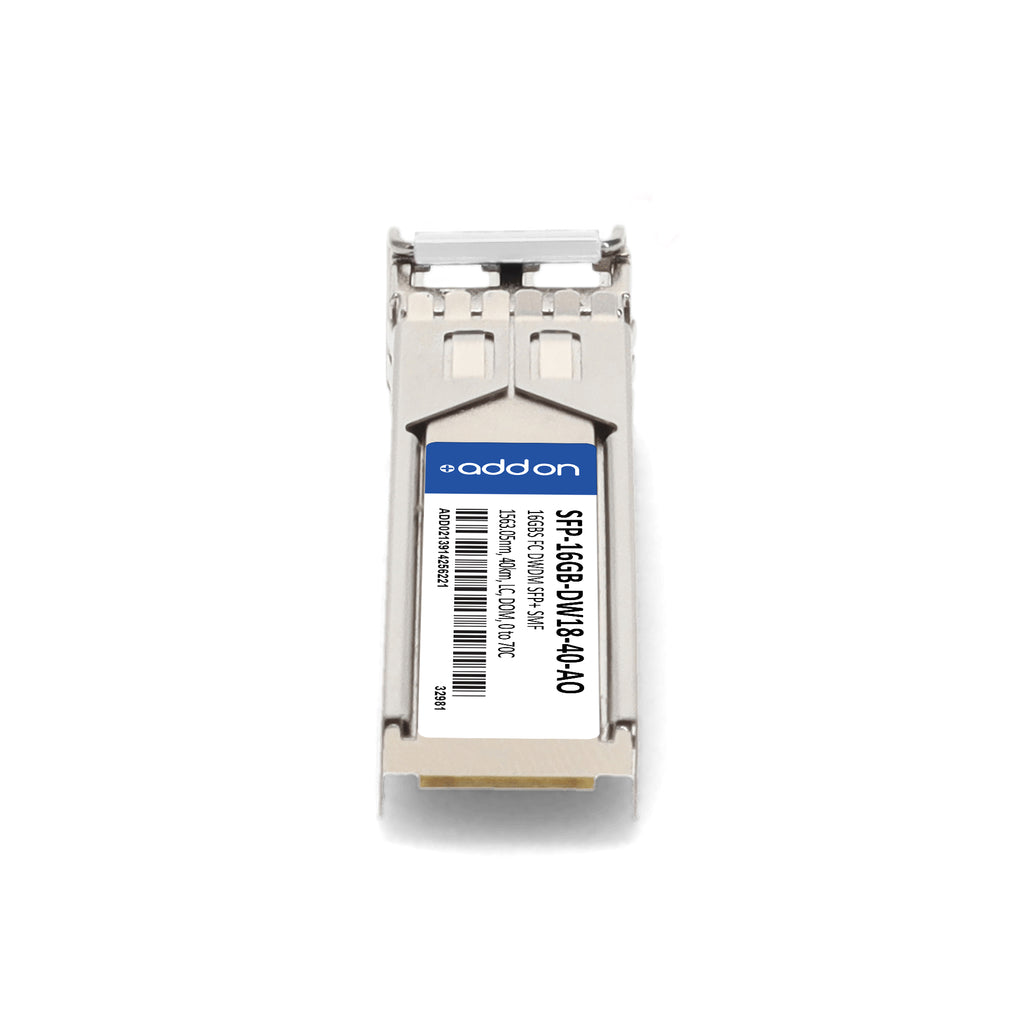 The AddOn SFP-16GB-DW18-40-AO is a high-performance, MSA-compliant SFP+ transceiver designed for 16GBase-DWDM Fibre Channel applications. Operating on ITU Channel DW18 (191.8 THz, 1563.05 nm), it delivers reliable optical connectivity up to 40 km over single-mode fiber (SMF) using a duplex LC connector.