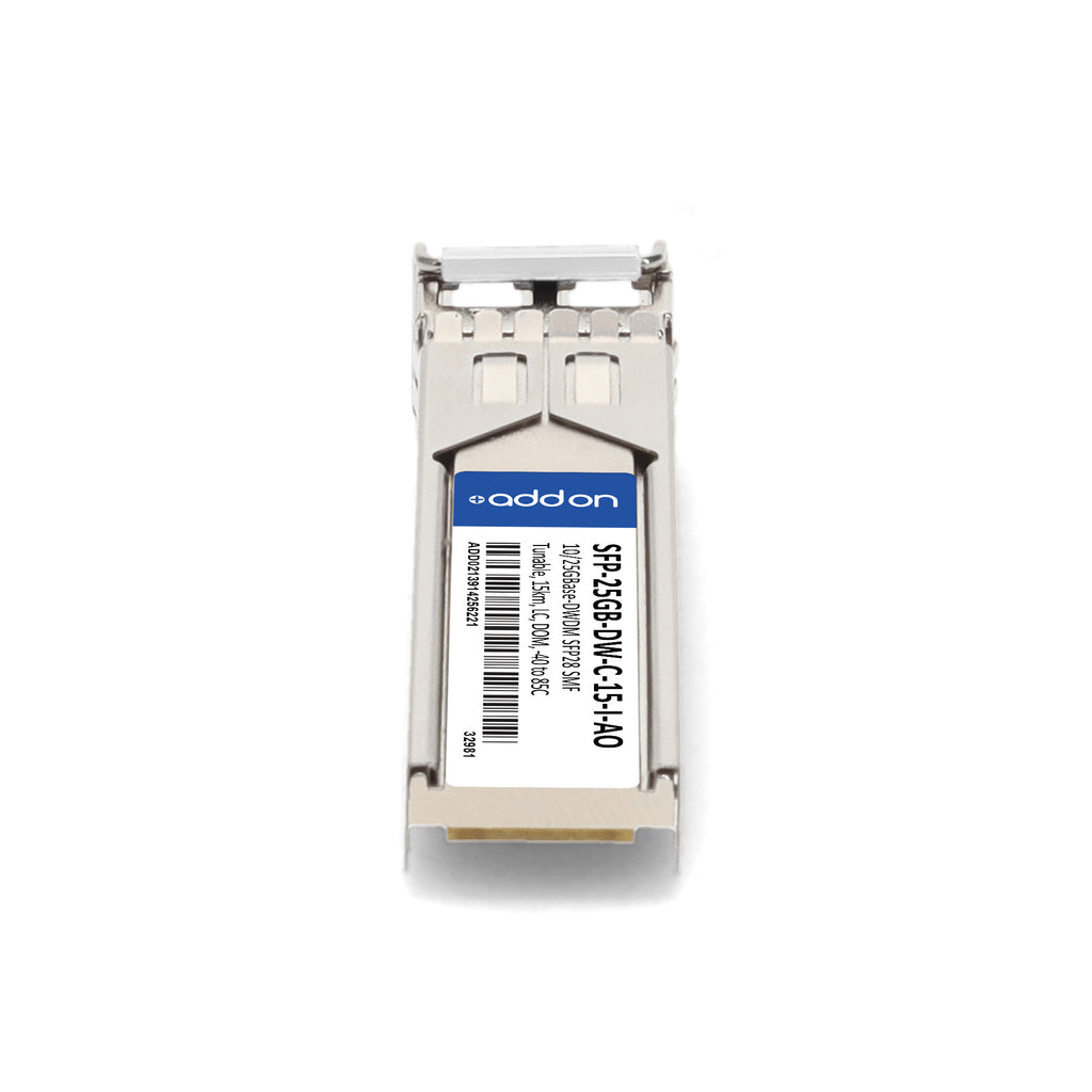 The AddOn SFP-25GB-DW-C-15-I-AO is a high-performance, dual-rate 10G/25G DWDM SFP28 transceiver designed for industrial-grade applications across access, metro, and enterprise networks. Compliant with SFF-8402 and SFF-8690 standards, it supports data rates from 9.8 Gbps to 25.78 Gbps and delivers up to 15 km transmission over single-mode fiber (SMF) with tunable wavelengths on the ITU-T 100 GHz DWDM grid.