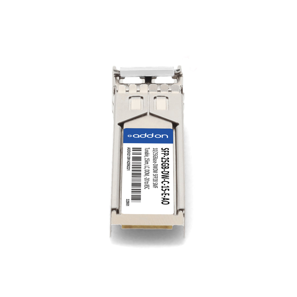 The AddOn SFP-25GB-DW-C-15-E-AO is a high-performance, MSA-compliant, dual-rate 10/25GBase-DWDM SFP28 transceiver designed for extended-range optical networks. Supporting tunable DWDM channels with 100 GHz spacing, it delivers reliable data transmission up to 15 km over single-mode fiber (SMF) using a duplex LC connector. The module supports data rates of 24.33024 G/25.78125 Gbps with FEC and 9.8304 G/10.3125 Gbps for 10 GbE applications. With Digital Optical Monitoring (DOM) for real-time diagnostics, excellent ESD protection, and hot-pluggable design, it ensures seamless integration into metro, enterprise, and access networks. Operating in an extended temperature range of -20 °C to 85 °C, this TAA-compliant transceiver is ideal for demanding, high-capacity environments requiring tunable DWDM flexibility and robust performance.