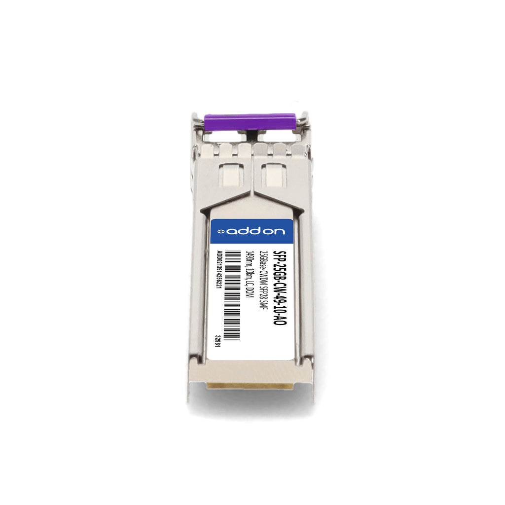 The AddOn SFP-25GB-CW-49-10-AO is a high-performance 25GBase-CWDM SFP28 transceiver designed for seamless integration into modern optical networks. It delivers reliable 25.78Gbps bi-directional data transmission over single-mode fiber (SMF) at a wavelength of 1490nm with a reach of up to 10km using a duplex LC connector.