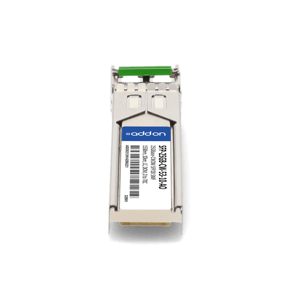 The AddOn SFP-25GB-CW-53-10-AO is a high-performance, MSA-compliant 25GBase-CWDM SFP28 optical transceiver designed for reliable and efficient data transmission up to 10km over single-mode fiber (SMF) using a 1530nm wavelength. Built with a CWDM-rated EML transmitter and APD receiver, this module delivers up to 25.78Gbps bidirectional data links and integrates seamlessly into access, metro, and enterprise networks, as well as mobile fronthaul applications (CPRI/OBSAI). Featuring digital optical monitoring (DOM) for real-time diagnostics, low power consumption, and full compliance with SFF-8431, SFF-8432, and SFF-8472 standards, this TAA-compliant transceiver ensures exceptional performance, reliability, and network interoperability. Each unit undergoes rigorous serialization, traffic, and application testing to guarantee consistent quality and compatibility.