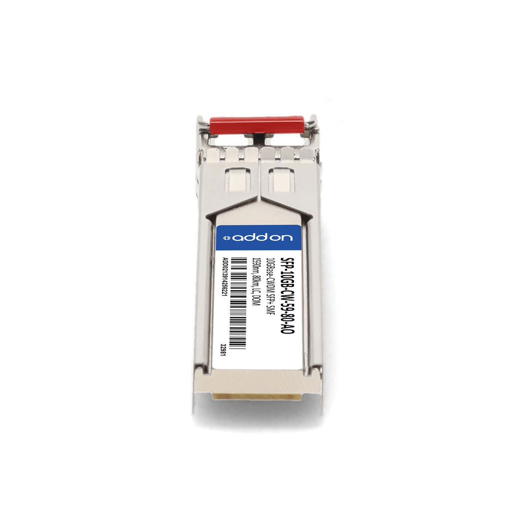 The AddOn SFP-10GB-CW-59-80-AO is a high-performance, MSA and TAA compliant 10GBase-CWDM SFP+ transceiver that delivers reliable 10Gbps connectivity over single-mode fiber (SMF) up to 80km using a 1590nm wavelength via a duplex LC connector.