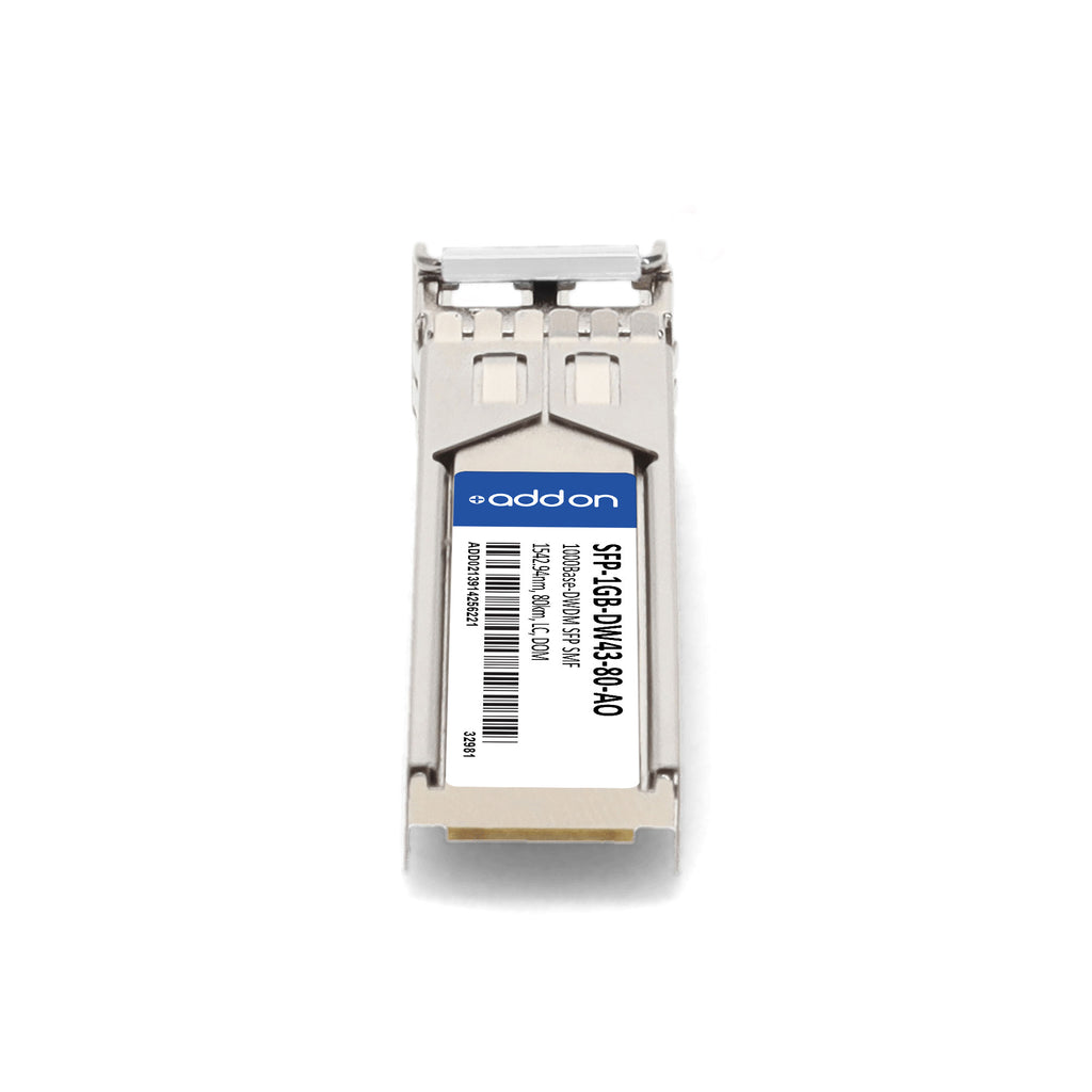 The AddOn SFP-1GB-DW43-80-AO is a high-performance, MSA-compliant 1000Base-DWDM SFP transceiver designed for long-distance data transmission up to 80km over single-mode fiber (SMF). Operating at a 1542.94nm wavelength, this hot-pluggable module supports duplex LC connectors and digital optical monitoring (DOM) for real-time performance tracking. It is ideal for Gigabit Ethernet and Fibre Channel applications across access, metro, and enterprise networks.