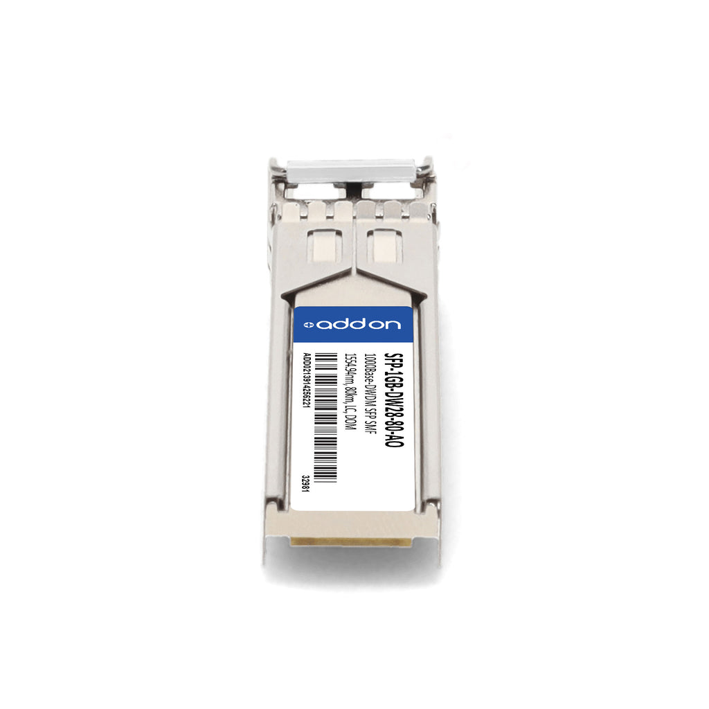 The AddOn SFP-1GB-DW28-80-AO is a high-performance, MSA-compliant 1000Base-DWDM SFP transceiver designed for long-haul data transmission up to 80km over single-mode fiber (SMF). Operating at a 1554.94nm wavelength with a 100GHz channel spacing, this hot-pluggable module provides seamless integration into Gigabit Ethernet and Fibre Channel networks.