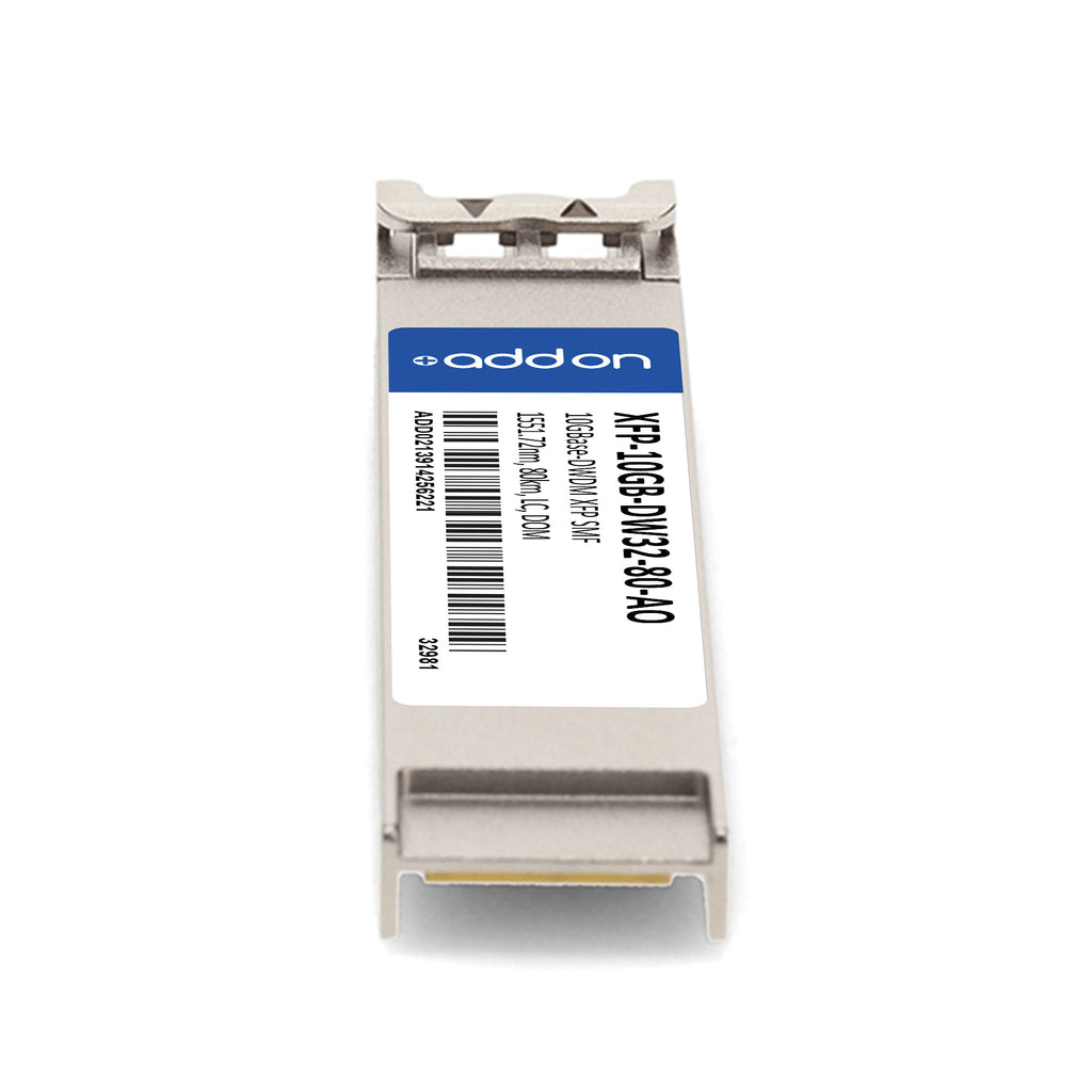 The AddOn XFP-10GB-DW32-80-AO is an MSA and TAA compliant 10GBase-DWDM XFP transceiver designed for long-haul optical networking. Delivering reliable 10Gbps performance up to 80km over single-mode fiber (SMF), this module operates at a 1551.72nm wavelength with a duplex LC connector.