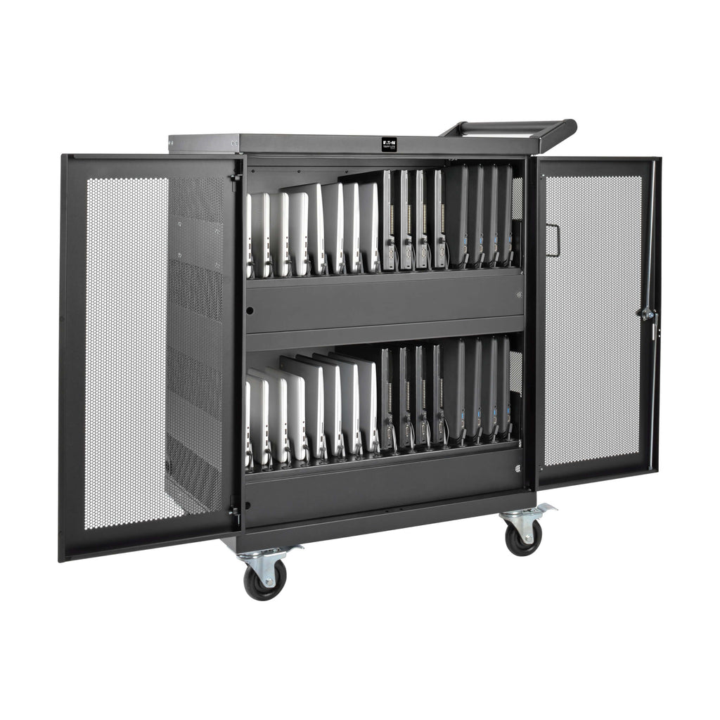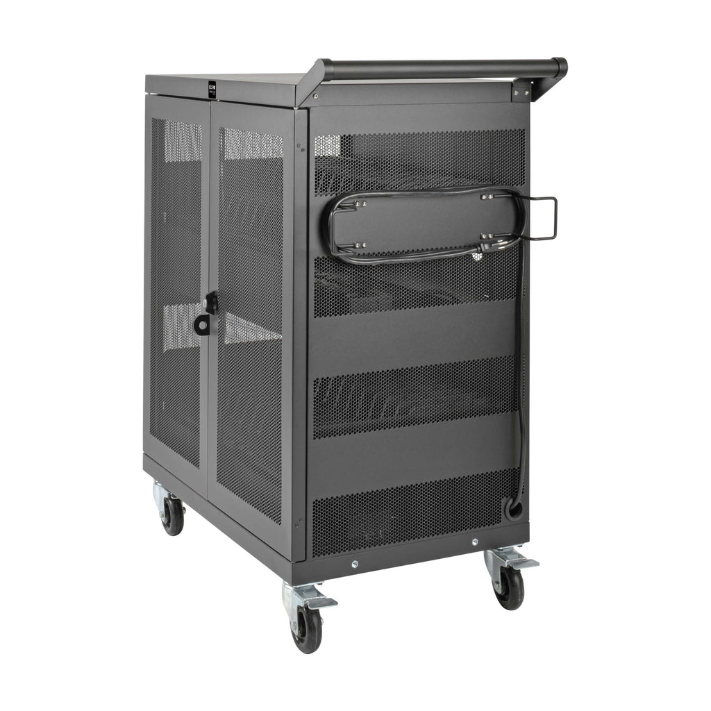 The Tripp Lite CSC32AC is a secure, mobile AC charging cart designed to store and charge up to 32 Chromebooks or laptops with screen sizes up to 15 inches. Built for education, office, healthcare, retail, and industrial environments, this rugged steel cart combines reliable power distribution with secure device storage and efficient cable management.