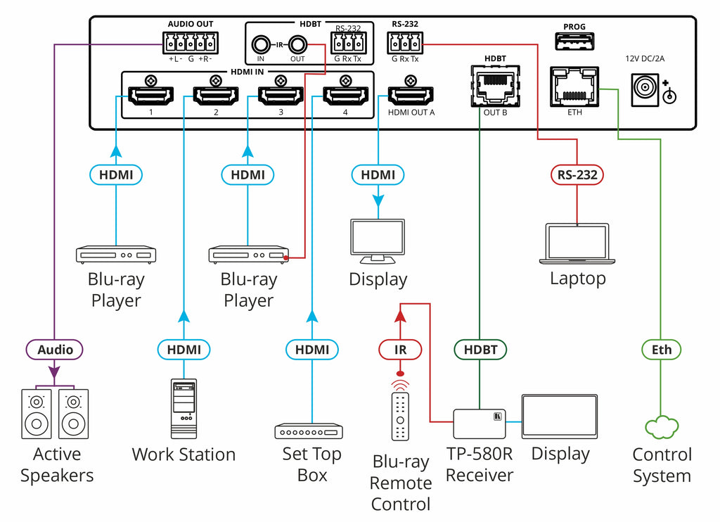 | Outputs | 1 × HDMI (female HDMI), 1 × HDBaseT (RJ-45), 1 × Balanced Stereo Audio (5-pin terminal block) |