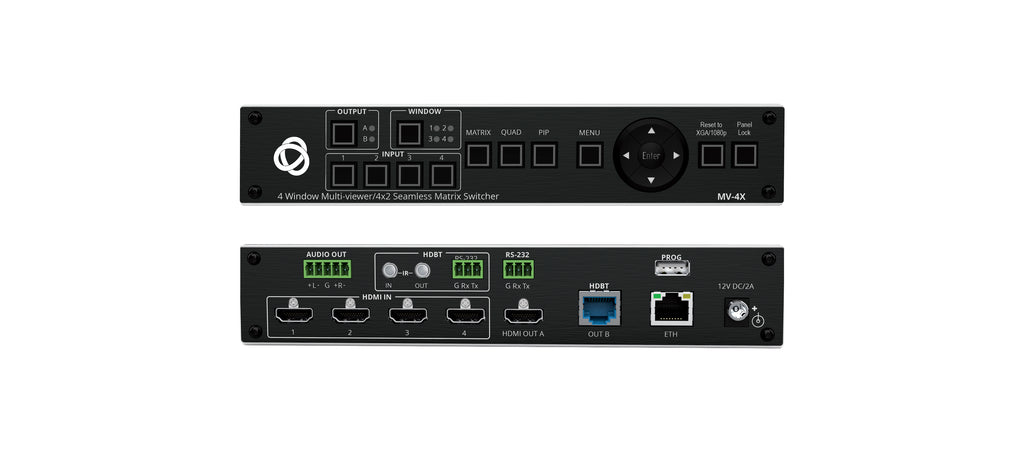 Control is streamlined through front-panel OSD keys, an intuitive built-in WebGUI, Ethernet, and RS-232. With robust EDID management and both HDMI and HDBaseT outputs, the MV-4X is a versatile, dependable solution for multi-source display and routing workflows.
