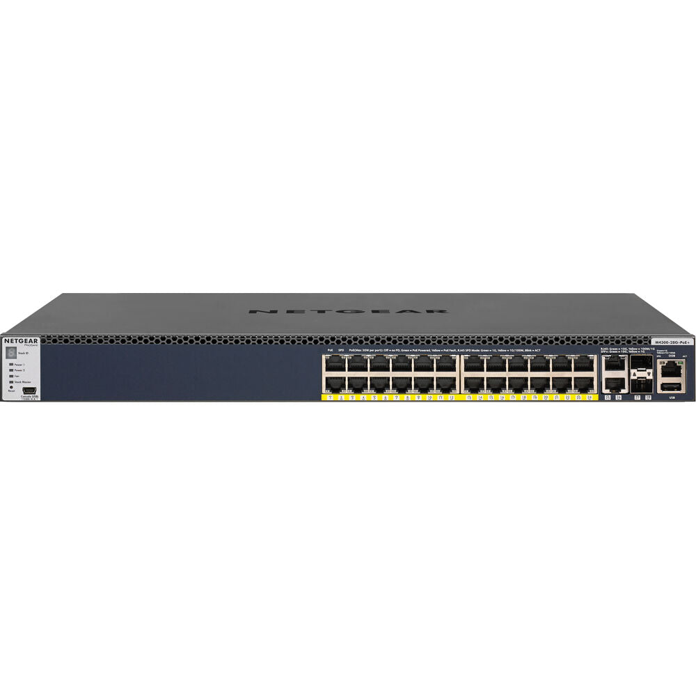 The NETGEAR M4300 Stackable Switch Series delivers L2/L3/L4 and IPv4/IPv6 cost-effective services for mid-enterprise edge with full PoE+ and SMB core deployments with unrivalled ease of use: 10 Gigabit models can seamlessly stack with 1 Gigabit models within the series, enabling spine and leaf line-rate stacking topologies. Non-stop forwarding (NSF) virtual chassis architectures provide advanced High Availability (HA) with hitless failover across the stack. Dual redundant, modular power supplies equipping full width models contribute to business continuity management. Layer 3 feature set includes static, dynamic and policy-based routing - as standard. Perfect for wireless access, unified communications and IP video, the NETGEAR M4300 Switch Series is also ready for the future, with Software-defined Network (SDN) and OpenFlow 1.3 enabled for your network. bBest-in-class stacking/bbr / ul M4300 is flexible enough for mixed stacking between 10 Gigabit and 1 Gigabit models, using any 10G port with any media type (RJ45, SFP+, DAC cables) High-availability is another key differentiator for stackable solutions: in case of a master switch failure, NSF and hitless failover ensure the standby switch takes over while forwarding plane continues to forward traffic on the operational stack members without any service interruption /ul bHigher flexibility/bbr / ul Two half-width M4300 switches can be paired in a single rack space for redundant Top of Rack installations with Auto-iSCSI prioritization 10 Gigabit ports are all independent and 1G backward compatible for progressive transition to 10G speeds /ul bLower complexity/bbr / ul Entire feature set including L2 switching (multi-tiered access control) and L3 routing (static, RIP, OSPF, VRRP, PIM, PBR) is available without license DHCP/BootP innovative auto-installation including firmware and configuration file upload automation /ul bInvestment protection/bbr / ul Line-rate spine and leaf stacking topologies offer multiple possibilities in server rooms, in branch collapsed cores or at the edge of growing networks Even if an organization is not ready for SDN, OpenFlow support offers future-ready design for maximum investment protection /ul bSecure services/bbr / ul With successive tiering, the Authentication Manager allows for authentication methods per port for a tiered authentication based on configured time-outs With BYOD, tiered Dot1x -amp;gt; MAB -amp;gt; Captive Portal authentication is powerful and simple to implement with strict policies /ul bIndustry standard management/bbr / ul Industry standard command line interface (CLI), functional NETGEAR web interface (GUI), SNMP, sFlow and RSPAN Single-pane-of-glass NMS300 management platform with centralized firmware updates and mass-configuration support /ul bIndustry leading warranty/bbr / ul NETGEAR M4300 series is covered under NETGEAR ProSafe Lifetime Hardware Warranty 90 days of Technical Support via phone and email, Lifetime Technical Support through online chat and Lifetime Next Business Day hardware replacement /ul