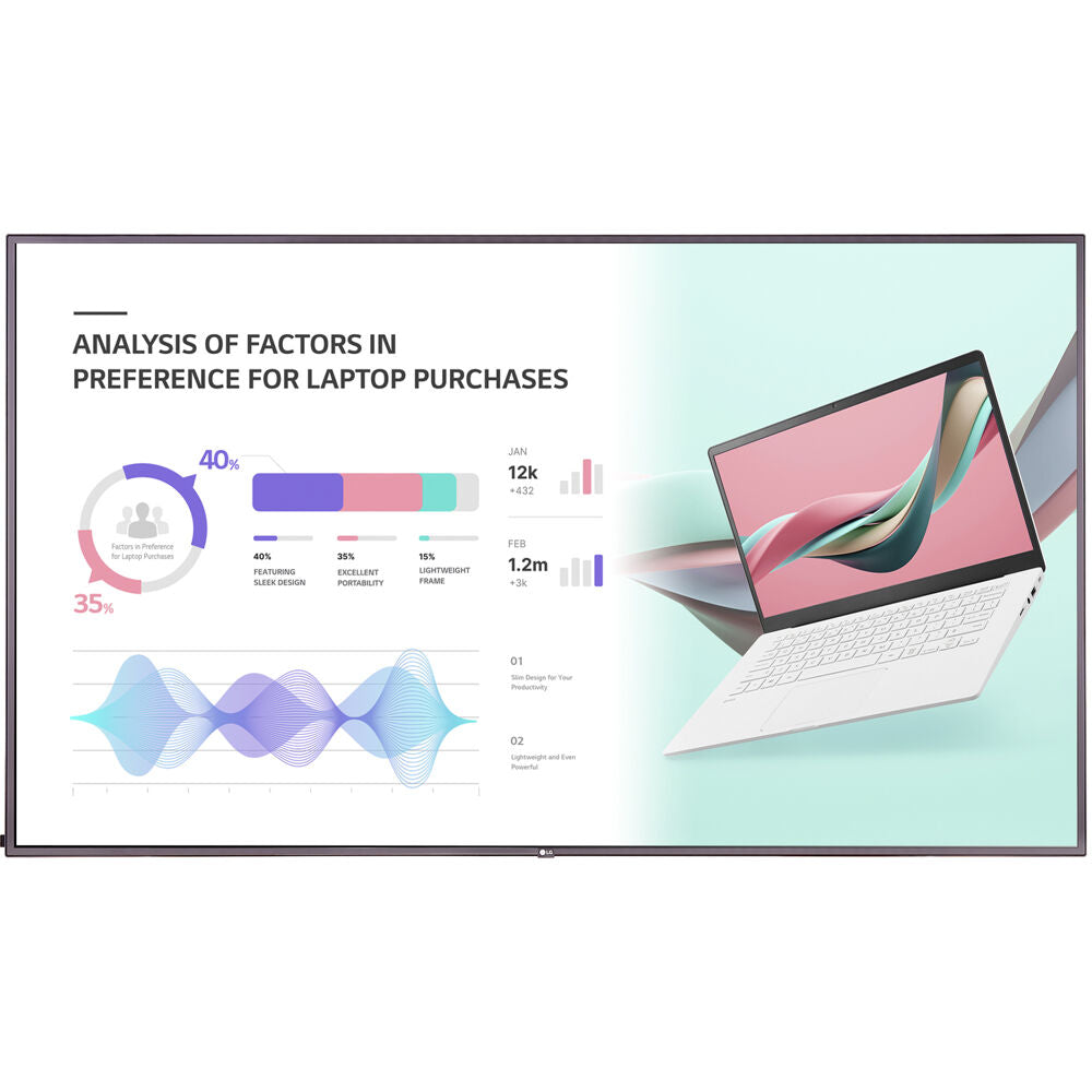The LG 75UH5J-MRBX is a professional-grade 75-inch UHD large format display engineered for reliable indoor digital signage. With a 3840 × 2160 resolution and a high-haze panel, it delivers clear, readable content even under bright ambient lighting. Its 500 cd/m² brightness level makes it well-suited for commercial environments such as meeting rooms, airports, retail spaces, and shopping malls.