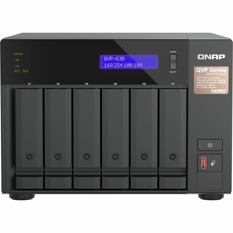 The QNAP QVR Pro QVP-63B is a professional-grade network surveillance station designed for dedicated video recording and monitoring without compromising performance. Unlike conventional NAS-based surveillance systems that share resources with other applications, the QVP-63B allocates full system power and storage space exclusively to surveillance tasks—ensuring smooth, uninterrupted recording and playback.