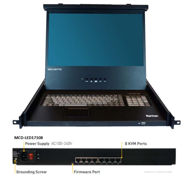 The Raritan MCD-LED17108 is a compact 1U LCD console drawer with an integrated 8-port digital KVM switch designed for small to midsized IT environments. It delivers Full HD video, intuitive at-the-rack server control, and the flexibility to manage both digital and analog video sources from a single device.