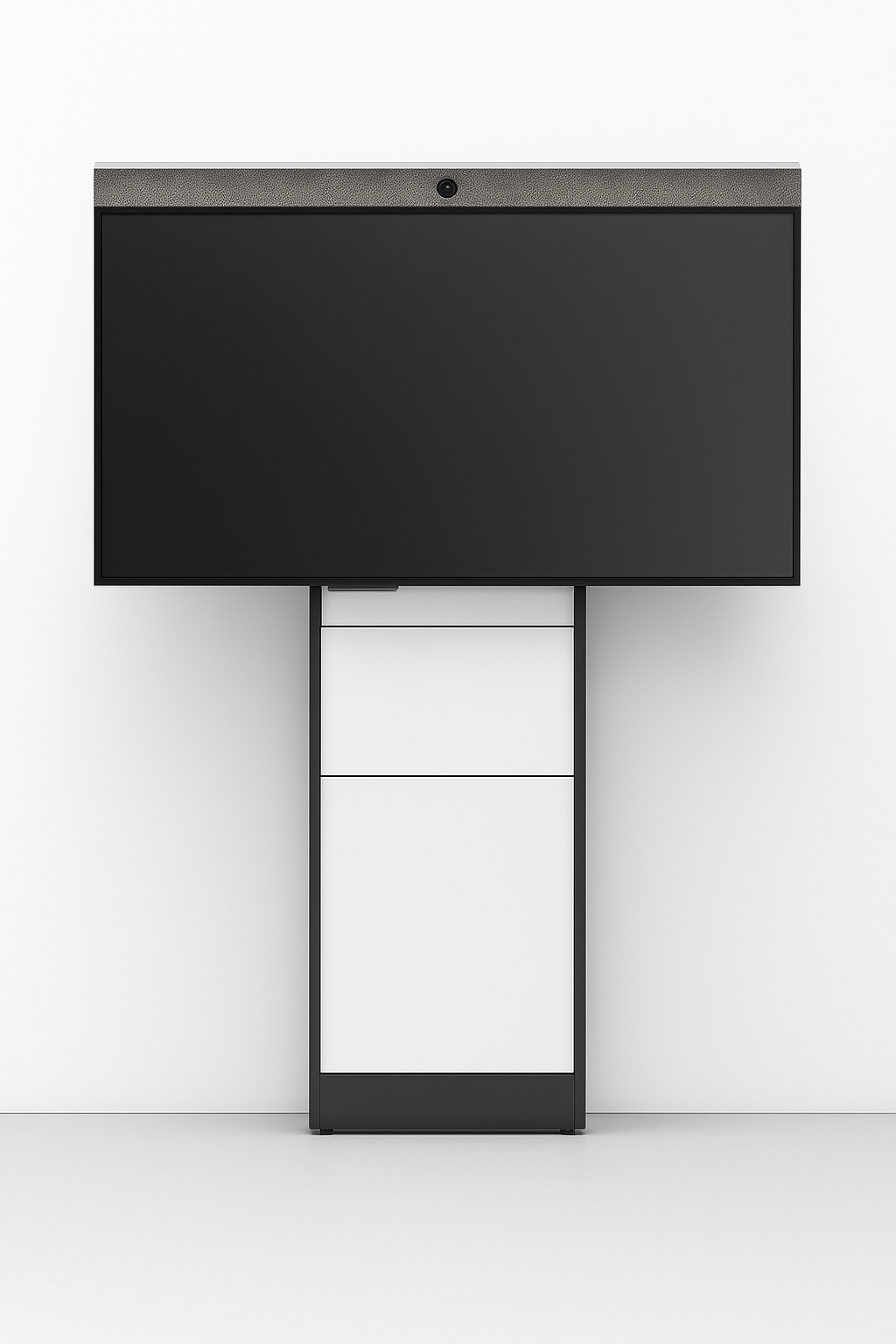 Its integrated storage compartment hides cabling, power, and small electronics behind a lockable white front panel, ensuring a clutter-free, professional environment. The black trim provides a striking contrast, enhancing the stand’s minimalist aesthetic. Ideal for conference rooms, classrooms, retail spaces, and collaboration areas, the Strut70 delivers effortless installation and exceptional reliability without wall reinforcement or downtime.