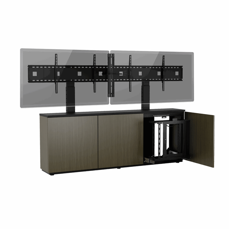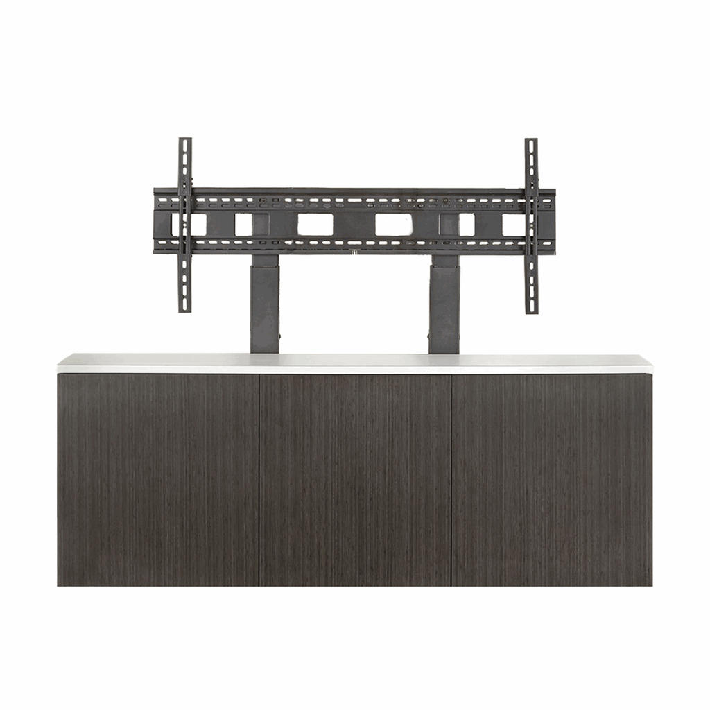 Each of the three bays features a sliding 3RU equipment mount, providing a total of 9RU to neatly organize and secure AV components. The open-back design ensures maximum airflow and efficient cooling for all installed devices. The integrated display mounting system eliminates the need for wall-mounted hardware and supports a single display up to 80" or dual displays up to 70". For stability and safety, the credenza anchors directly to the wall.