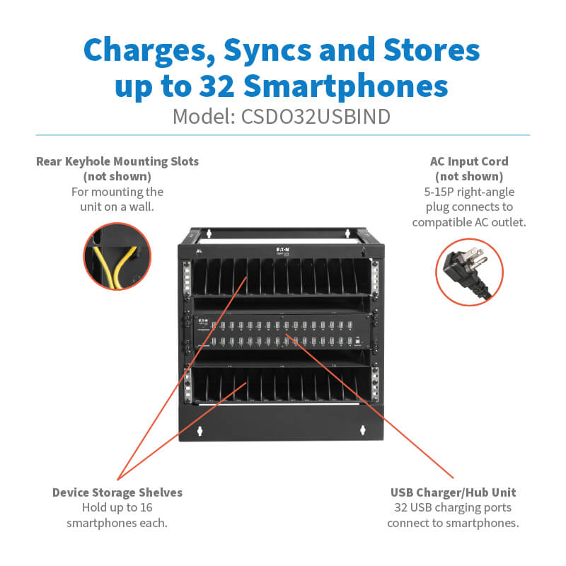 The Eaton Tripp Lite CSDO32USBIND is an industrial-grade open-frame USB charging and syncing station designed to power, organize, and secure up to 32 Zebra devices, handhelds, or smartphones. Each port delivers up to 2.4A for fast, efficient charging, while the integrated USB uplink enables data syncing, firmware updates, and device configuration management — all within a durable steel enclosure ideal for warehouses, factories, healthcare, and commercial environments.