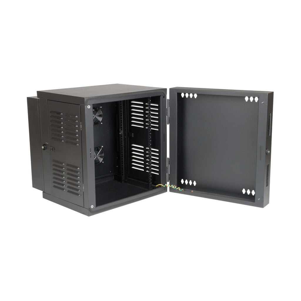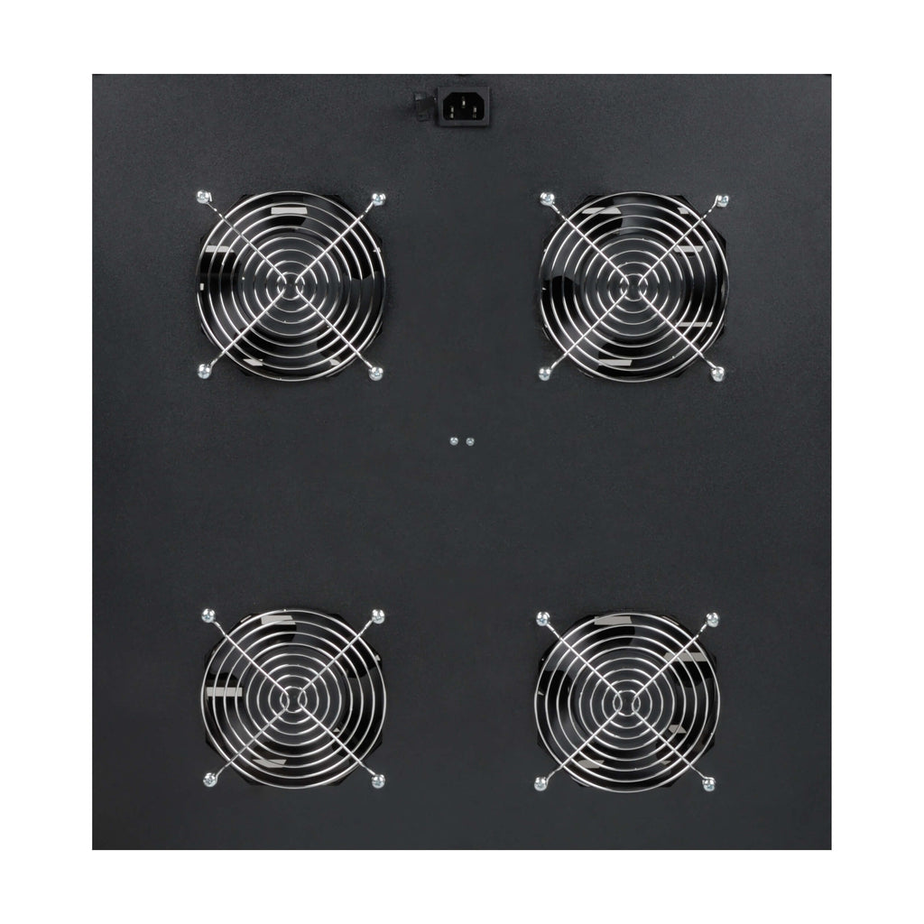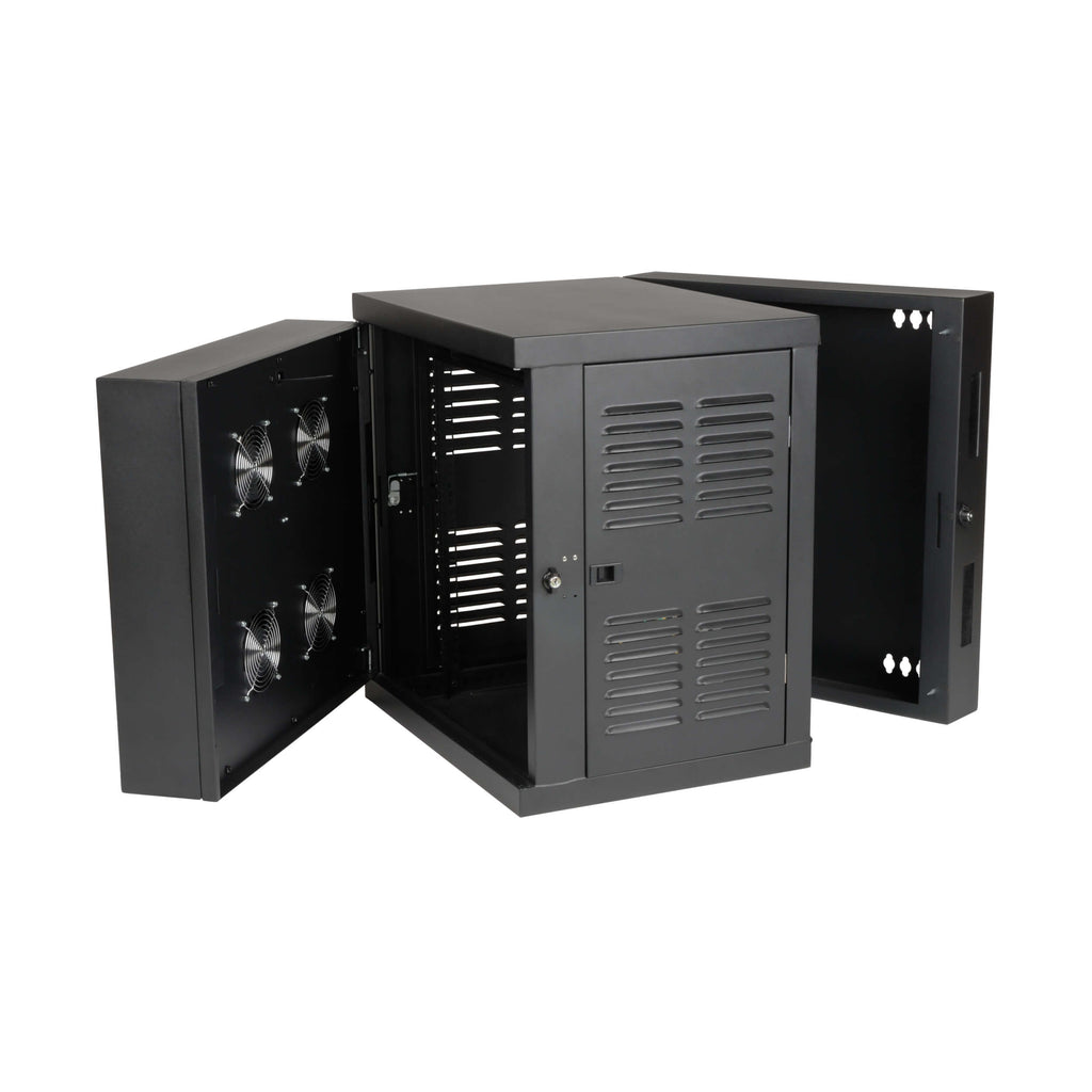 Built from heavy-duty steel with a durable black powder-coat finish, the cabinet supports up to 200 lb of equipment. Integrated filtration, sealing gaskets, and louvered ventilation work together with four high-performance intake fans to maintain airflow while keeping contaminants out. The hinged, swing-away design allows easy rear access for installation and maintenance, while locking doors and panels help prevent tampering or theft.