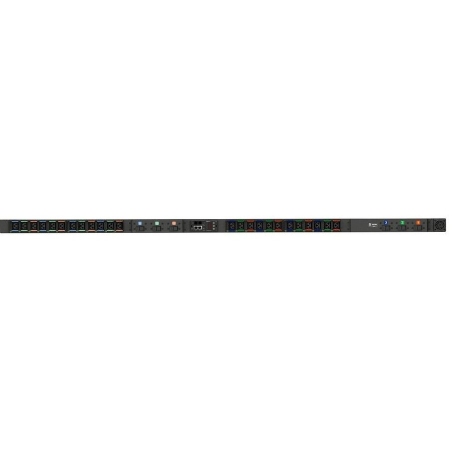 The Vertiv Geist GU2 rPDU VP7UV002 is a Switched Outlet Level Monitored 0U vertical rack power distribution unit that delivers 22.0kW of power through (24) lock-compatible combination C13/C19 outlets. Designed for high-density IT environments, it features a universal inlet, outlet-level switching, and input power monitoring.