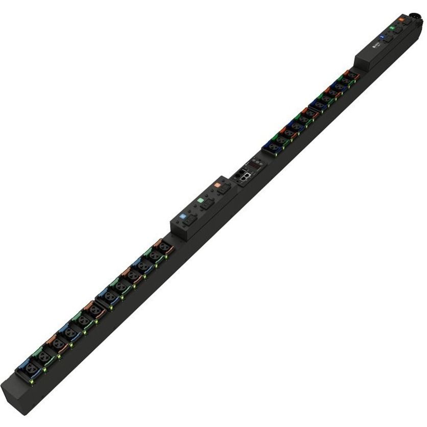 This PDU allows administrators to remotely power cycle unresponsive equipment or shut off outlets to prevent overloads. The hot-swappable Interchangeable Monitoring Device (IMD) supports real-time monitoring and advanced network management protocols including SNMP, RADIUS, TACACS+, and more.