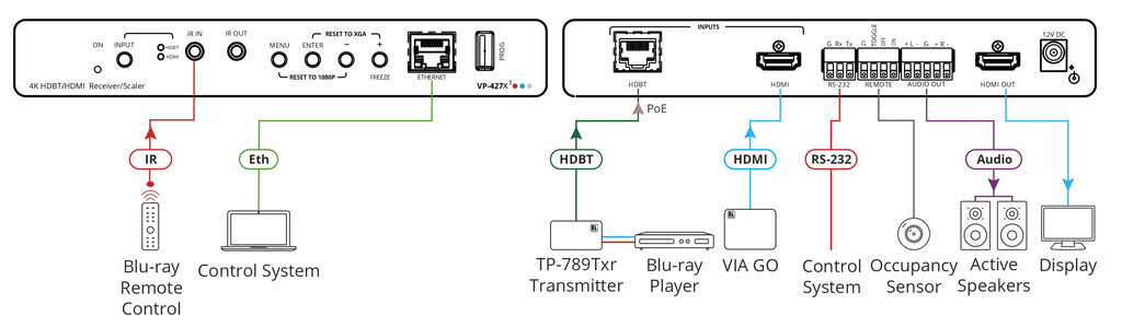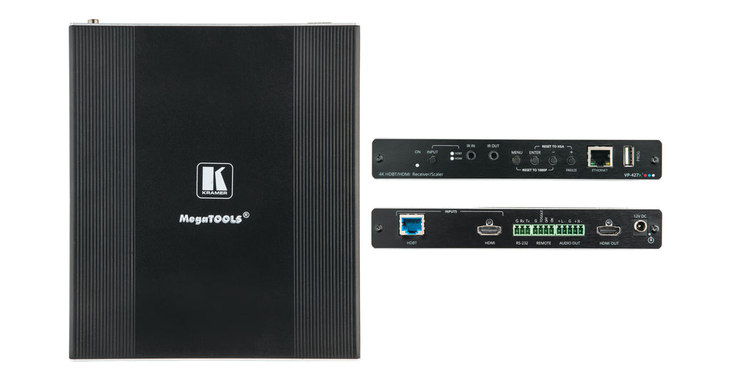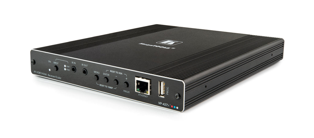 The Kramer VP-427X1 is a high-performance 2x1 auto-switcher and scaler receiver designed for modern AV environments requiring seamless 4K signal handling, intelligent source selection, and long-reach HDBaseT connectivity. Engineered for reliability and flexibility, the VP-427X1 receives HDBaseT signals from compatible transmitters, converts them to HDMI, and scales video up or down to match any display resolution up to 4K@60Hz (4:4:4).