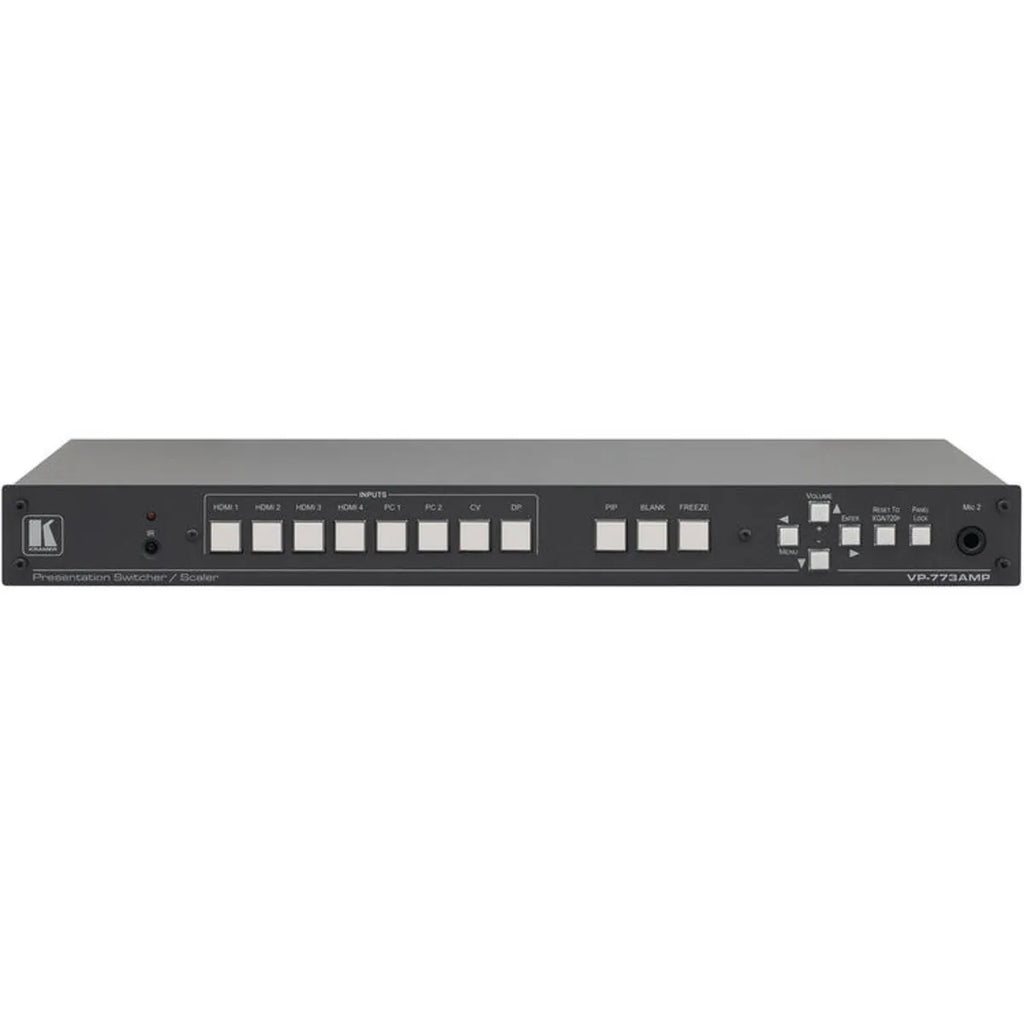 The Kramer VP-773A(AMP)/110V is a high-performance 8-input presentation switcher and scaler designed for professional AV environments that demand seamless switching, flexible connectivity, and exceptional image quality. It supports HDMI, HDBaseT, VGA, composite, and DisplayPort sources—automatically scaling and outputting video simultaneously through dual HDMI ports and an HDBaseT transmitter.