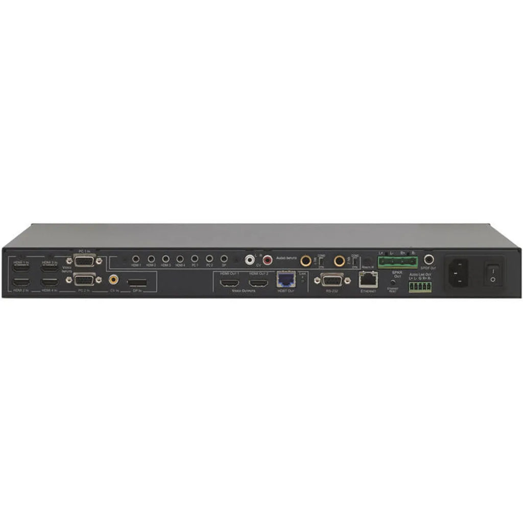 | Inputs | 4 HDMI; 2 VGA (15-pin HD); 1 composite video (RCA); 1 DisplayPort; 4 HDMI audio (3.5mm); 2 VGA audio (3.5mm); 1 CV audio (RCA L/R); 2 mic inputs (6mm phono) |
