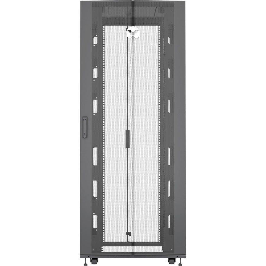 The Vertiv™ VR3150-007 Rack Cabinet is a 42U enclosed server rack built to support high-density IT applications. Engineered with powder-coated steel for durability and finished in sleek black, it features a 19" rail depth and supports a wide array of equipment including servers, switches, routers, KVM switches, PDUs, and UPS systems. With dynamic weight capacity of 2253.12 lb and a static load rating of 2998.29 lb, this cabinet ensures dependable strength for mission-critical environments. Designed for global IT deployments, it offers fast installation and reliable cable management with lockable side panels and a reversible front door.