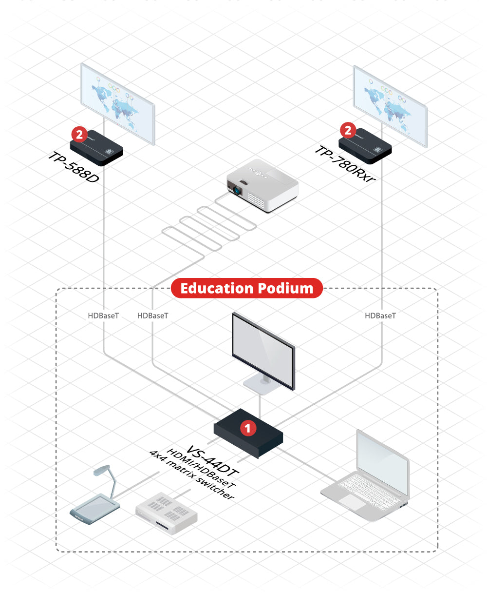 Engineered for extended-reach applications, the VS-44DT delivers video, audio, Ethernet, IR, and RS-232 over long distances while acting as a PoE provider for compatible HDBaseT receivers. With flexible control options—including an embedded web server and RS-232—the unit is ideal for conference rooms, auditoriums, command centers, and digital signage systems.